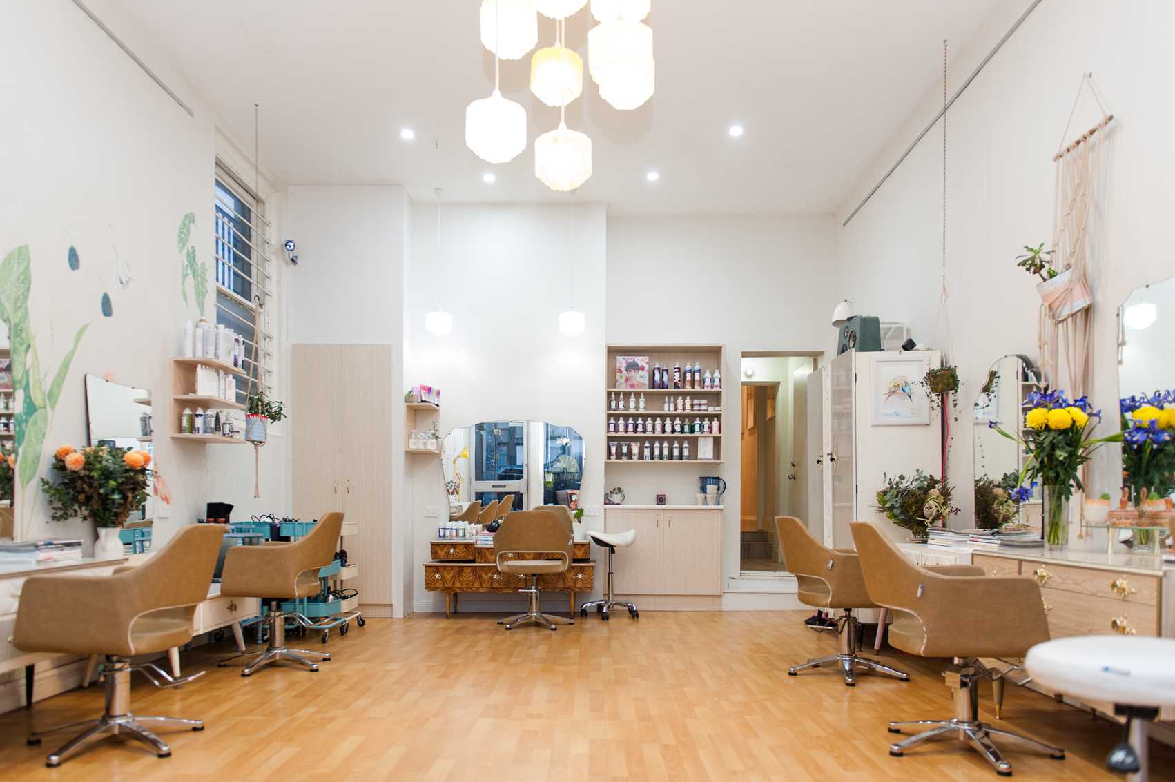Our philosophy behind the look and feel of our space is for it to be homely, welcoming, un-pretentious and a delight to visit. We like cups of tea, macramรฉ hanging planters and our budgie, Kenny. Itโs kind of like visiting your nana but you come out with fabulous hair.